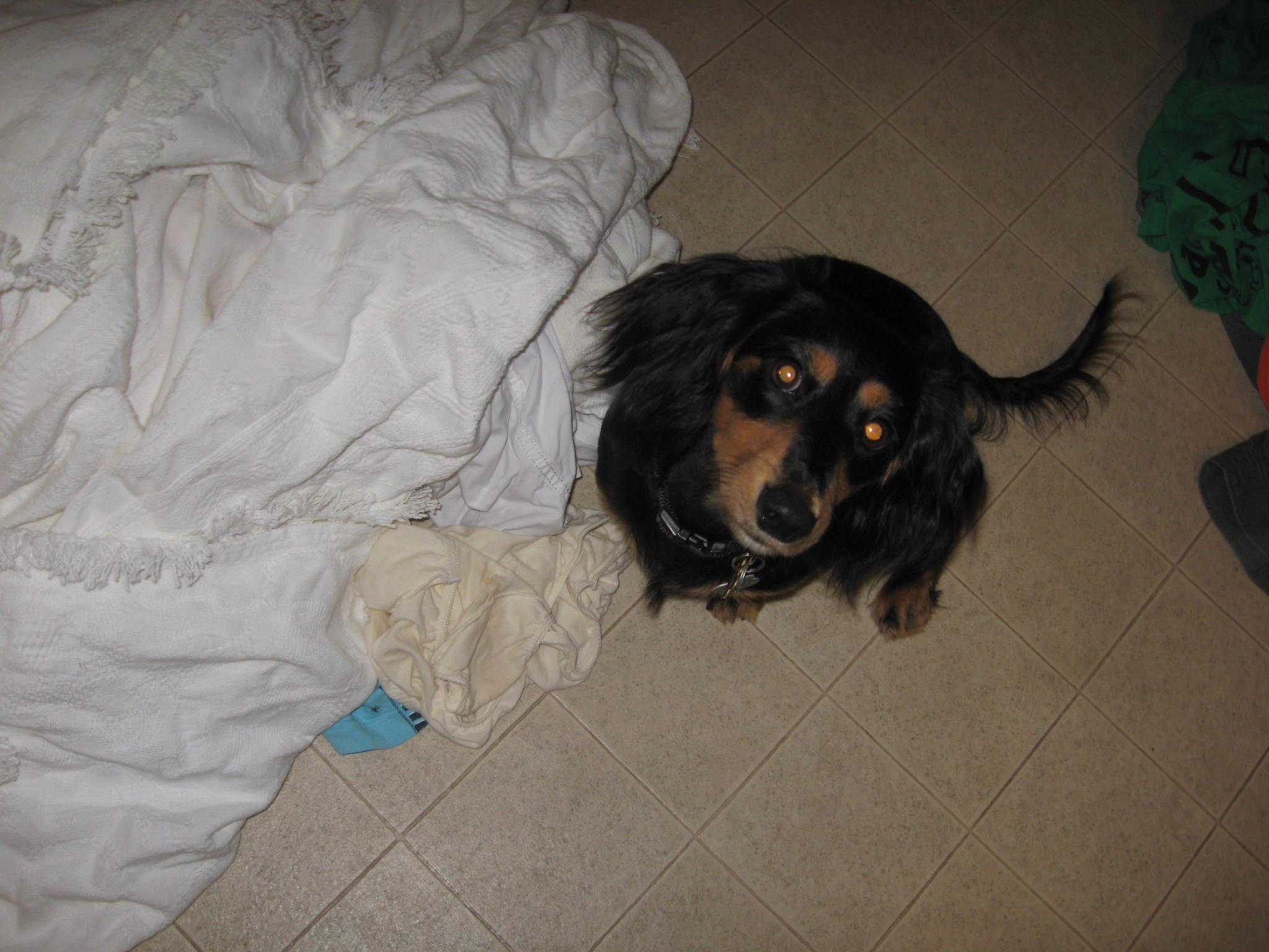 As I pull sheets, towels and various articles of clothing from the laundry chute, I toss them in piles of lights and darks. Mick will happily snuffle around in the stack of dark tee shirts and jeans, but he knows the mother lode is in the pile of lights. Every time he’s able to sneak off for a quick gnaw on a pair of dirty underpants, you can just sense that he’s experiencing a little slice of doggie heaven.