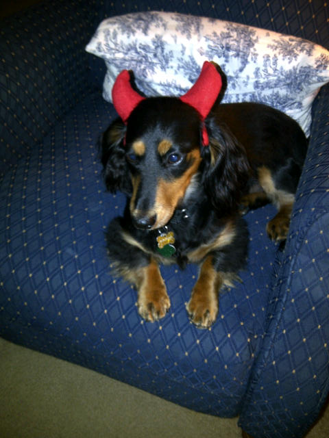 I could go on and on. He has (I think) the most angelic little face with  beautiful markings and soft floppy ears. But he can be a devil. I got him little red felt devil horns for Halloween (forgive me, Chris – I know you said you did not want me to ever put the dog in costume, but I couldn’t resist).